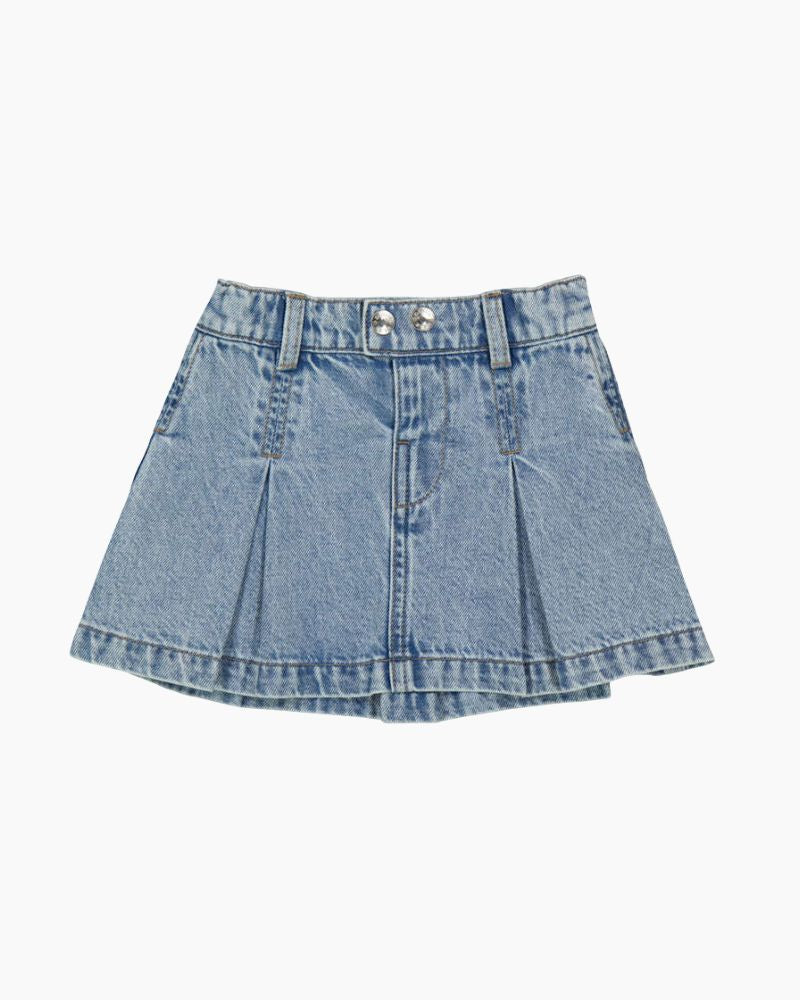 PLEATED DENIM SKIRT - MD DENIM / 2T is backordered and will ship as soon as it is back in stock.