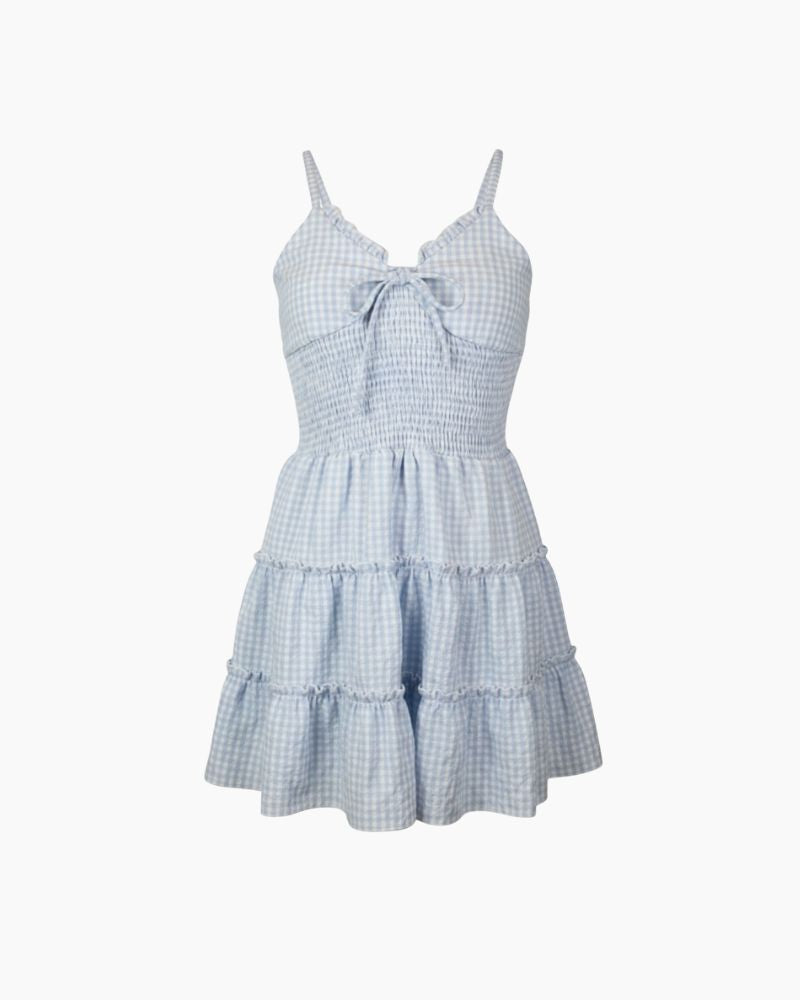 SL BOW DTL SMOCK TIERED BTM GINGHAM DRESS - BLUE / 8 is backordered and will ship as soon as it is back in stock.