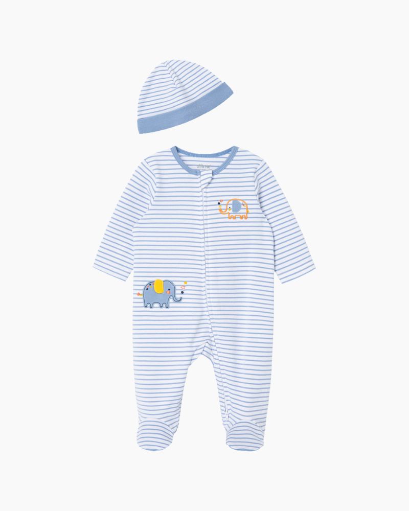 LS APLQ ELEPHANT FOOTIE + HAT - BLUE / NB is backordered and will ship as soon as it is back in stock.