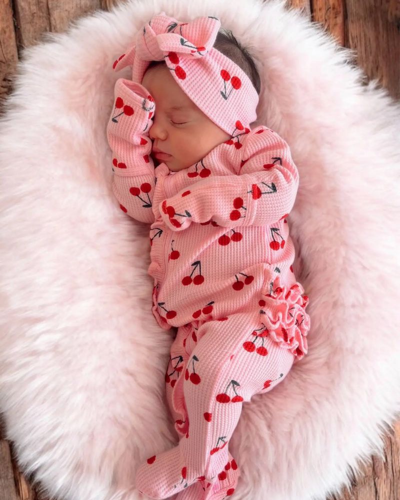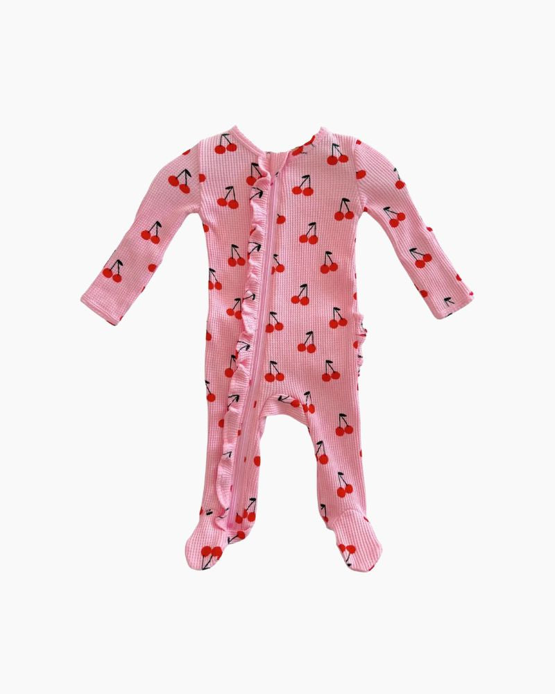 CHERRY WAFFLE RUFFLE FOOTIE - PINK / NB is backordered and will ship as soon as it is back in stock.