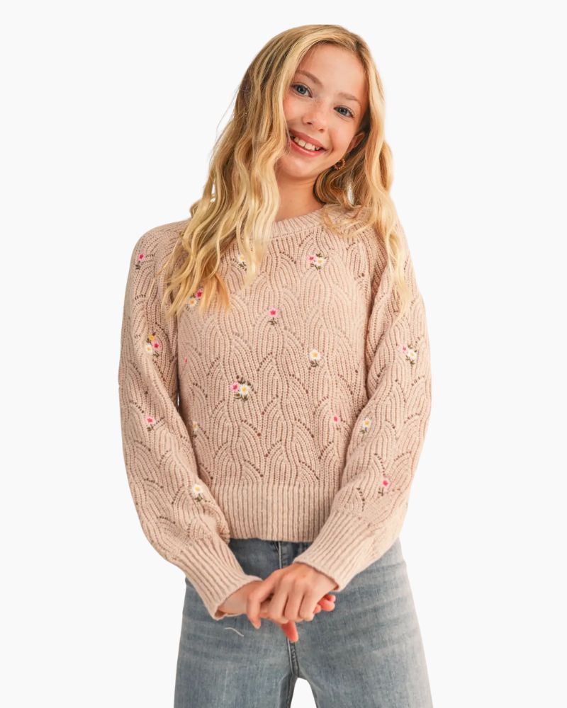 FLORAL EMBROIDERED WAVE KNIT SWEATER