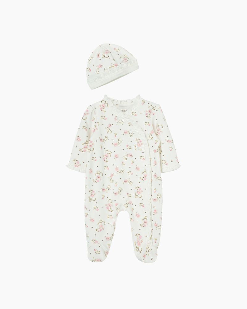 LS VINTAGE ROSE FOOTIE + HAT SET - WHITE / PREE is backordered and will ship as soon as it is back in stock.